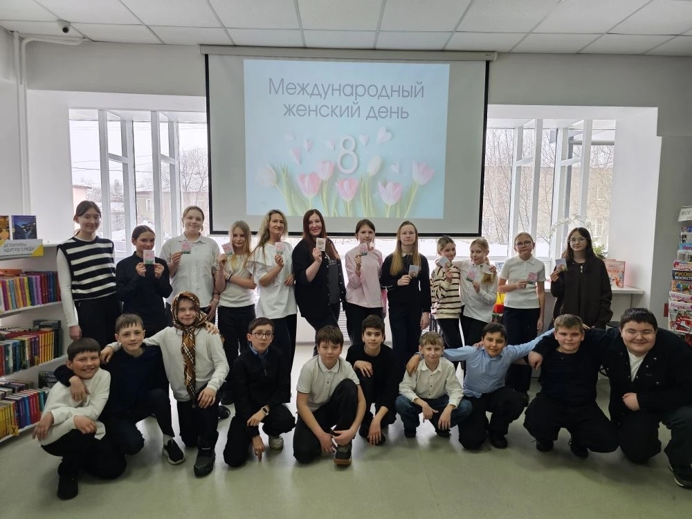В Библиотеке «Книжная радуга» прошла спортивно-игровая программа «А ну-ка, девочки!» для МБОУ «Средняя общеобразовательная школа № 52». Команды «Ромашки» и «Тюльпаны» соревновались в танцах и дефиле, а мальчики поздравили одноклассниц открытками.